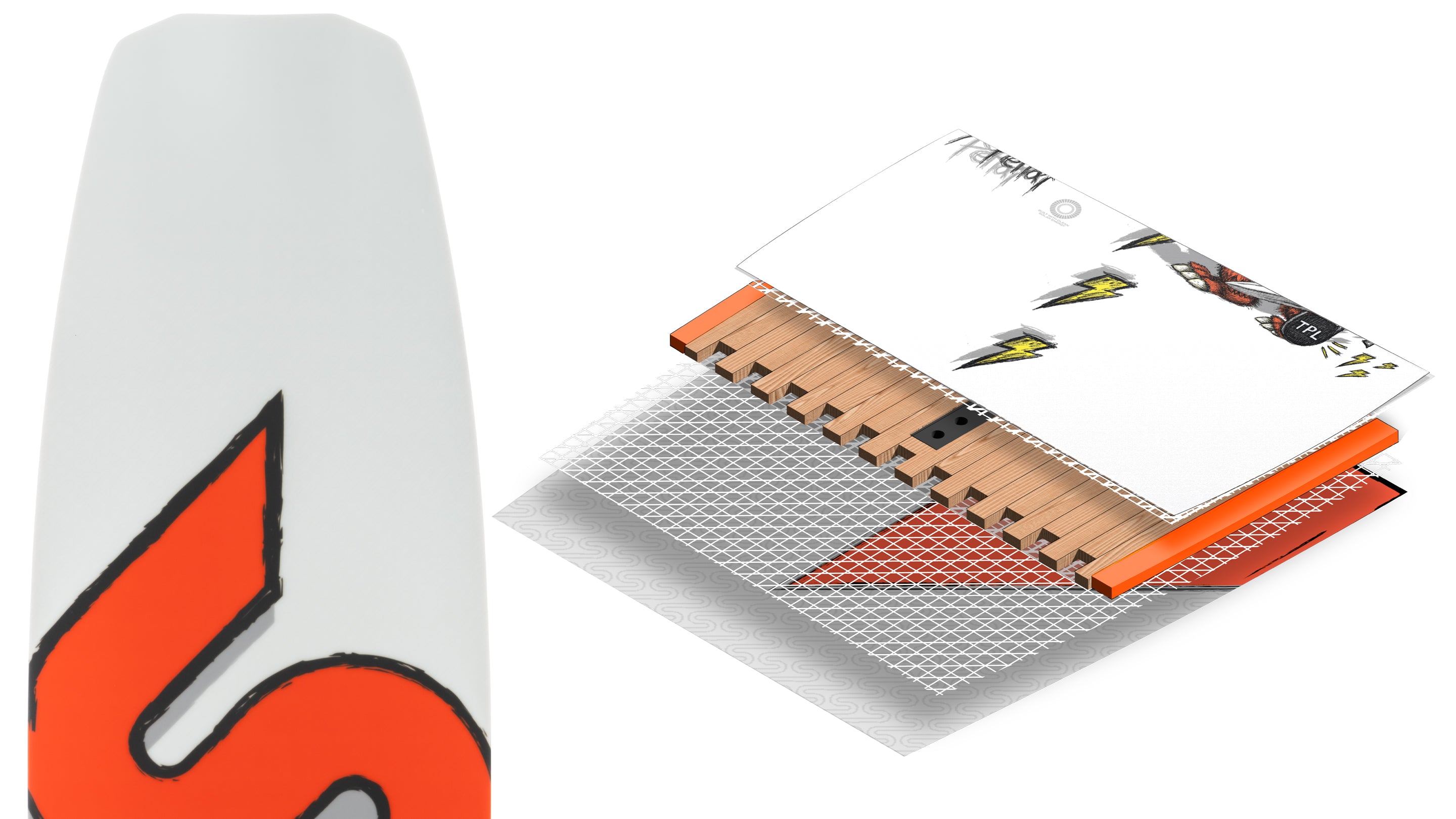 Light, flexible, and super strong. Reduces overall board weight, increases pull strength, and allows for a more consistent flex under foot.